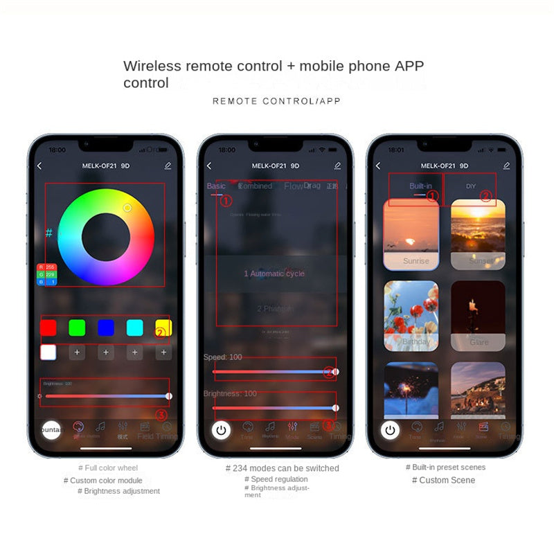 Colors and flowing light mode of the driving status can be adjusted through the APP (Bluetooth)