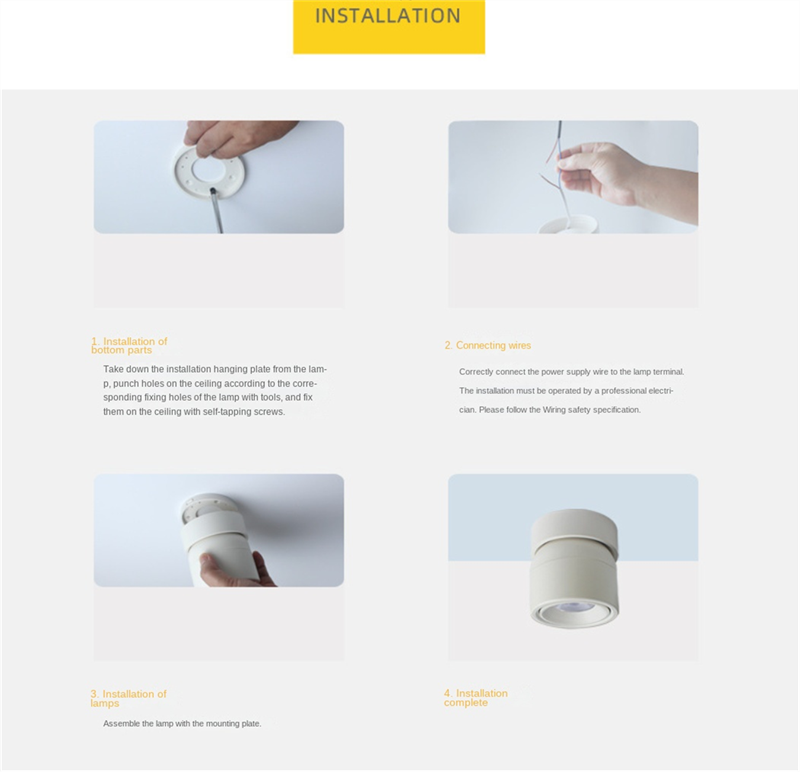 This surface-mounted LED spotlight is designed for modern no-main-light ceiling systems. With a 360° rotatable + 90° tiltable lamp head, you can precisely direct light to TV background walls, wall art, bedrooms, hallways, and decorative corners—all without cutting any holes in the ceiling.
