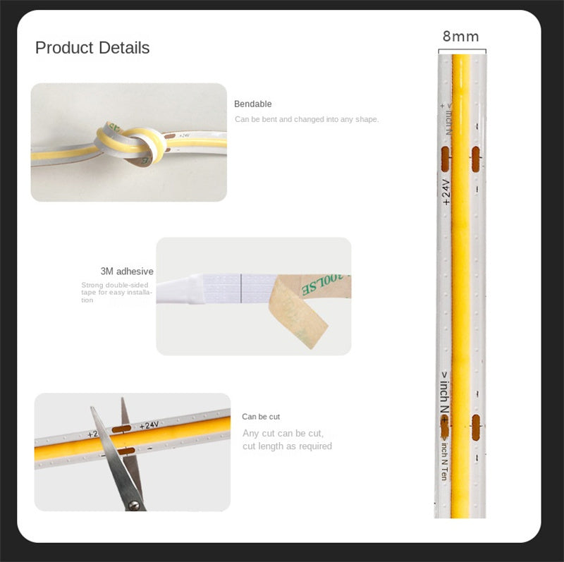 RGB COB LED Strip – 8mm Flicker-Free Ambient Decor